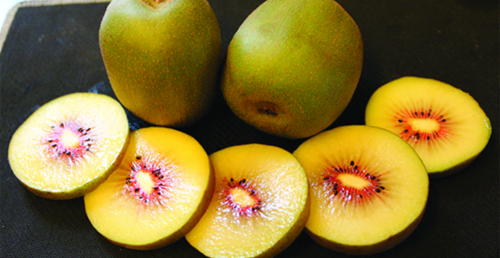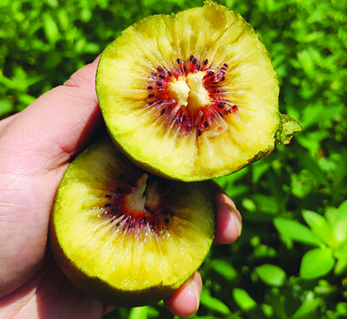長江流域和江淮地區(qū) 8 月中下旬成熟,可延遲采收 到 10 月上中旬,可替代紅陽的紅心獼猴桃品種,在長江流域表 現(xiàn)最好的紅心品種之一。由中國科學(xué)院武漢植物園選育,果形 長圓,均果重 85 克,大果 120 克,正常管理園 90-110 克特級 果可控制在 75% 左右。果皮綠褐色,無毛;果肉黃色,果心四 周呈放射狀紅色 , 肉質(zhì)細(xì)嫩,汁液多,含糖量 17-24%。風(fēng)味濃 甜,有明顯的甘蔗香味。果實(shí)較耐貯藏,1-3℃可存放 3-4 個 月,該品種樹勢比紅陽強(qiáng),且較抗?jié)儾〉炔『Γ⒐诋產(chǎn) 量 1500 公斤。