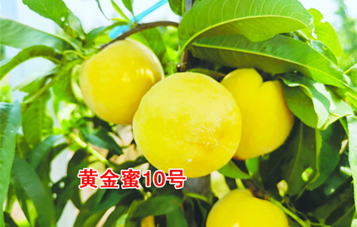黃金蜜 10 號(hào)    5 月中旬成熟,中國(guó)農(nóng)科院鄭州果樹所最新育成的特早熟硬肉黃桃新品種,授權(quán)奧林園藝公司繁育推廣,也是目前最早熟的硬肉黃桃品種,有“露地黃桃第一桃”之稱。比黃金蜜 1 號(hào)早 12-15天,比黃金蜜 7 號(hào)還早熟 4-5 天。該品種果實(shí)近圓形,果皮底色黃,不套袋著紅色,套袋果純黃不返色。均果重 185 克,正常疏果單果重 220-300 克。風(fēng)味甜,品質(zhì)優(yōu)良,含糖量 12-15%。SH 肉質(zhì)。離核,掛樹 20天后會(huì)變沙甜口感。掛樹時(shí)間及貨架期長(zhǎng),耐貯運(yùn)。自花結(jié)實(shí),早果豐產(chǎn)。引種至少 100 株起,100-499 株,12 元 / 株;500 株以上 10 元 / 株(全國(guó)統(tǒng)一價(jià))。